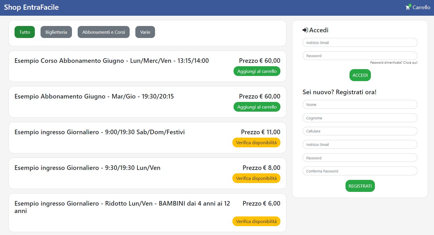 Il nostro e-commerce unisce le funzionalità di un negozio online alla praticità di un gestionale per il controllo degli accessi e l’accettazione.